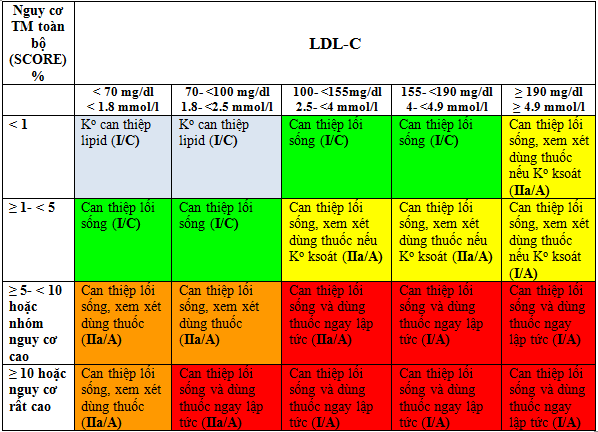 · Mức đích được khuyến cáo là < 190 mg/dl (< 5 mmol/l) đối với cholesterol toàn phần và < 115 mg/dl (< 3 mmol/l) đối với LDL-C ở bệnh nhân có mức nguy cơ thấp-trung bình (I/A).